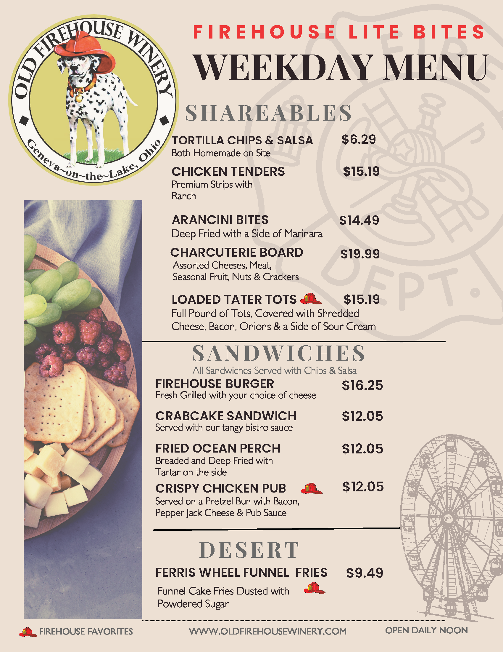 Old Firehouse Winery offers an extensive menu for adults and kids menu for your little ones.
